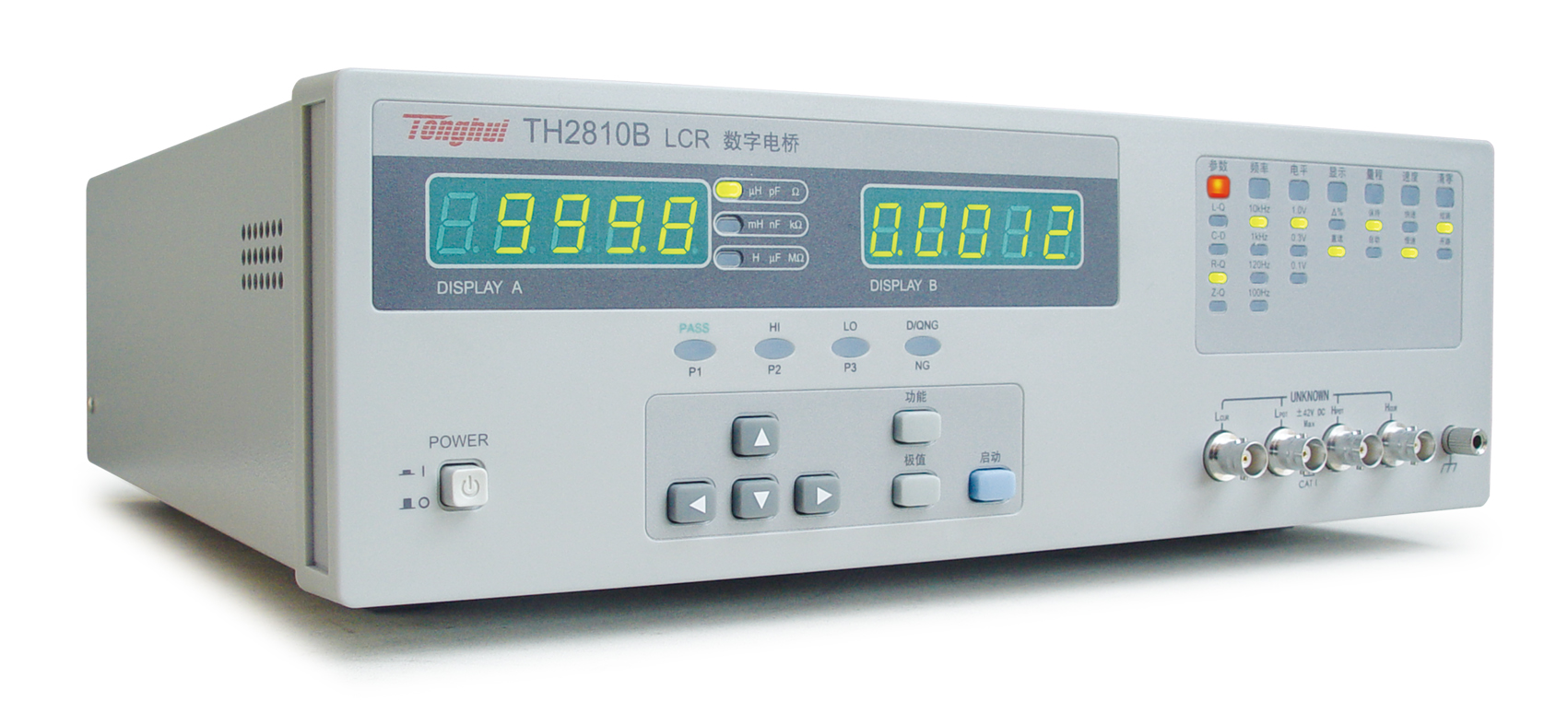 ■?數(shù)字電橋 TH2810B型LCR數(shù)字電橋是一種測試速度快、精度高、測試范圍寬的通用阻抗測量儀器。 四個測試頻率點,最高至10kHz, 30Ω 、100Ω兩種不同信號源輸出阻抗可使儀器測量結果與眾多LCR結果相一致,同時也能適應陶瓷電容器對測量電平的要求。?