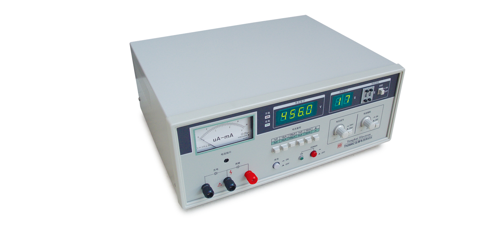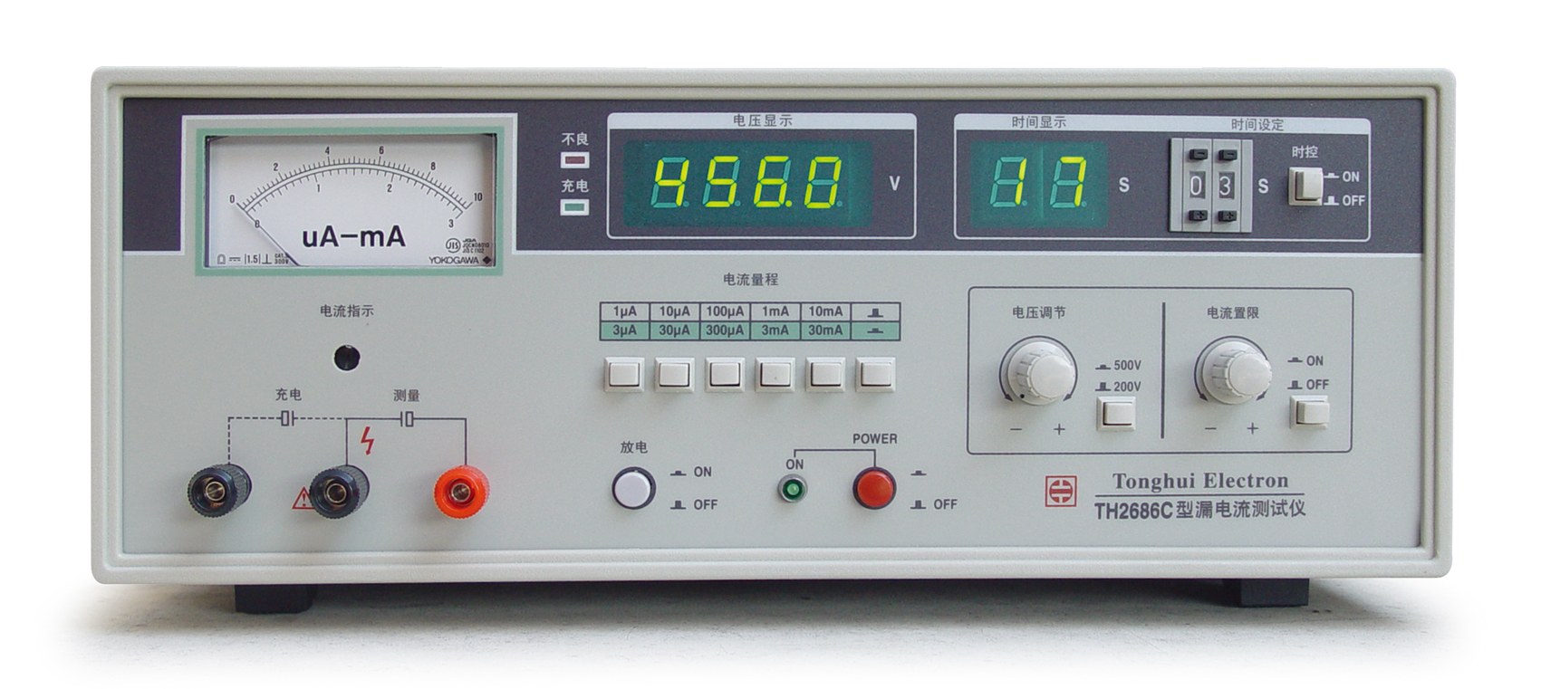 ■?TH2686C型電解電容漏電流測試儀是一種能自動測量電解電容漏電流參數的測試儀器。測試電壓連續可調。電壓值、充電時間數字顯示,電流值表針指示,充電—測試自動轉換。具有電流超限指示,測試速度快,操作方便,安全可靠等特點。適用于生產線的質量保證及進貨檢驗。