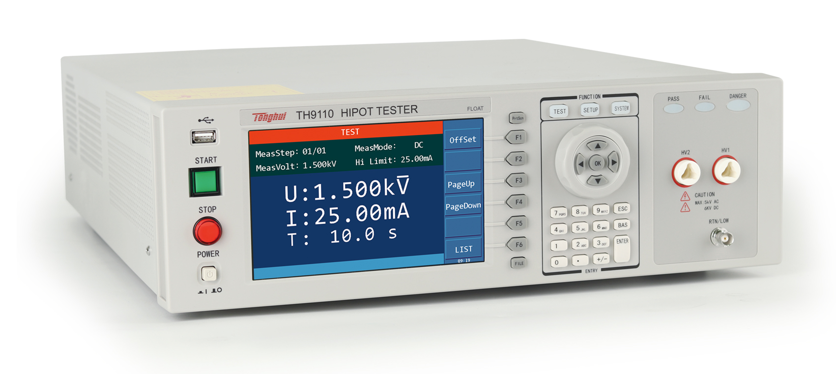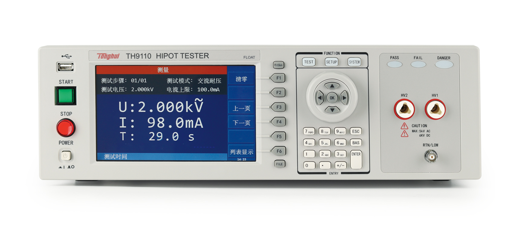 ■?TH9110/TH9110A是集同惠多年電氣安規測試儀的設計經驗,新推出的具有500VA功率,最大輸出交流5kV/100mA的新一代交直流耐壓/絕緣電阻測試儀,符合大功率耐壓測試需求,符合EN50191的設備安全標準。TH9110/TH9110A系列除了基本的交流、直流、絕緣電阻測試外,增加了崩潰電壓測試功能,可分析產品的擊穿點電壓,滿足特定客戶對產品高壓可靠性檢測的要求; 具有開短路檢測功能,解決了用戶在測試安規產品時的可靠性和準確性問題,輸出時同步進行接觸檢查,避免漏檢,提升測試可靠度與效率。TH9110/TH9110A使用7寸LCD彩色顯示器,測試結果用大字符顯示,更加清晰直觀,方便操作與判斷。高壓浮動輸出設計、觸電保護功能等,確保了客戶在接觸到高壓測試端的時候也不會被電擊傷害,保證操作人員的人身安全。