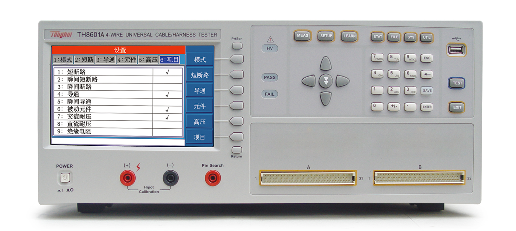 TH8601A 線材綜合測試儀簡介■?TH8601系列四端線材綜合測試儀是專用于各種線纜,線束和排 線品質(zhì)及連接可靠性檢驗(yàn)的多功能,自動化的線材綜合參數(shù)測試 系統(tǒng)。該系統(tǒng)提供可編程的恒流恒壓源以及高壓源,測試項(xiàng)目涵蓋了導(dǎo)通,被動元件(電感,電阻,電容,二極管),交直流耐壓,絕緣電阻各種高低壓參數(shù)。本系統(tǒng)采用先進(jìn)的LCR數(shù)字采樣及高速長壽命通道切換技術(shù),大大提高了測試精度,速度以及使用壽命。采用高低