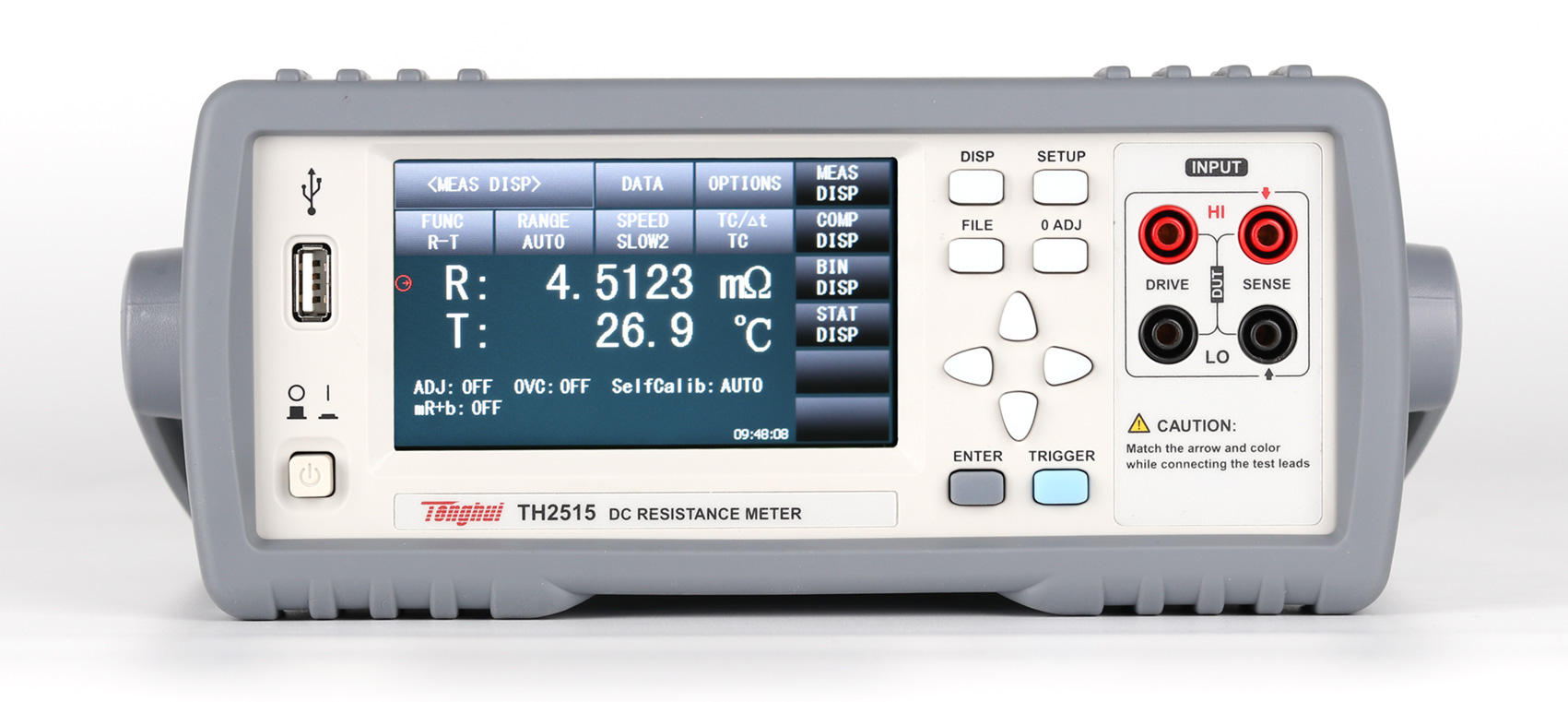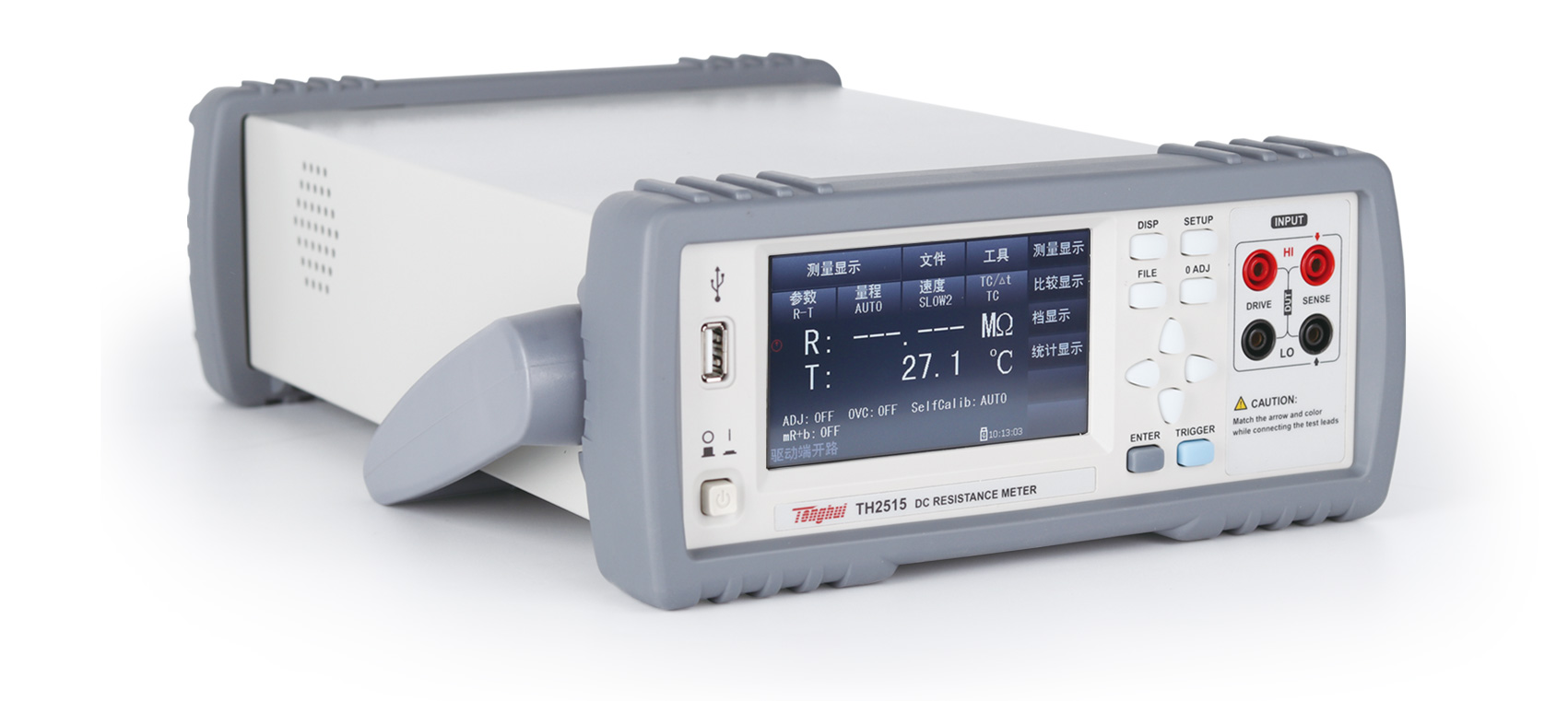 ■ 同惠電子憑借其在阻抗測試領域深厚的技術積淀和廣泛的市場調研,推出了帶觸摸功能和彩色液晶顯示的直流阻抗測試儀器--TH2515系列直流電阻測試儀。其較高的性能、便捷的操作、精美的外觀足以相較于市場上的前沿產品。TH2515系列直流電阻測試儀采用當前主流的32bits CPU和高密度SMD貼裝工藝,帶觸摸功能的24位色4.3英寸彩色液晶屏,界面清爽、操作便捷;0.01%的最高電阻測量精度及0.1uΩ最小電阻分辨率在國內首屈一指,其適用于繼電器接觸電阻、接插件接插電阻、導線電阻、印制板線路及焊孔電阻等;很好的消除了熱電對被測元件接觸的影響而引起的潛在誤差;溫度補償和溫度轉換功能免除環境溫度對測試工作的影響;失調電壓補償功能能夠有效消除被測件的自身的電動勢以及接觸電勢差;其超高速的測試速度以及通過handler接口可以輸出10檔不同邊界的比較結果信號,便于生產線上的自動化操作。TH2515系列提供了幾乎所有主流的接口功能,可方便的與PC進行數據通訊和遠程控制。